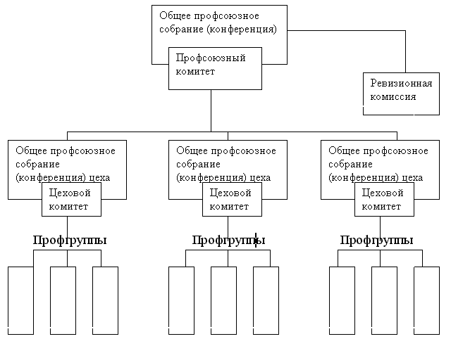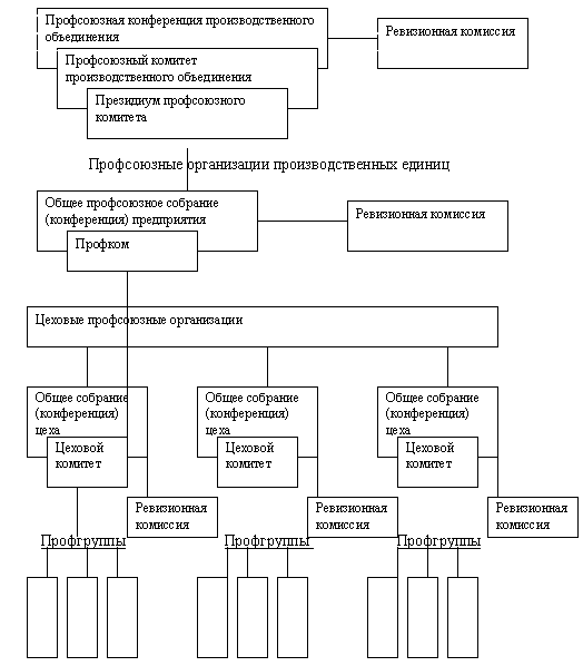 На крупных производственных объединениях по решению центральных комитетов профсоюзов создаются единые профсоюзные организации и их комитеты. Организационная структура профсоюзной организации и порядок создания профкома зависят от территориального расположения входящих в объединение производственных единиц и их правового положения. В производственном объединении, структурные единицы которого расположены в пределах одного района, города, области, края, республики (без областного деления), создается единая профсоюзная организация и избирается профсоюзный комитет.