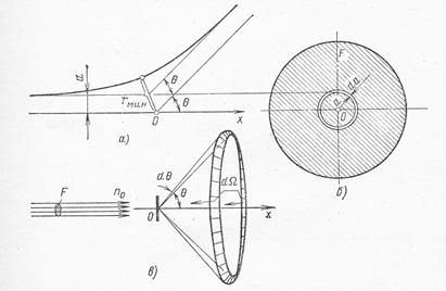 а) – схема рассеяния в плоскости траектории частицы; б) – кольцо, из которого происходит рассеяние под углом θ; в) – схема рассеяния в конический телесный угол под углом θ к оси.