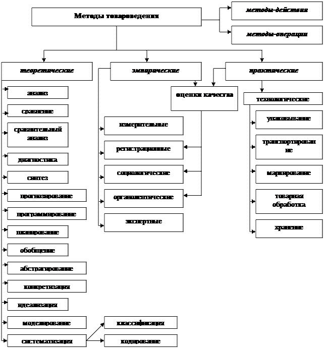 3. Практические методы – методы, основанные на технологических действиях и операциях, предназначенных для определения характеристик товара (качества, количества, товарной информации) и обеспечения их сохранения при товародвижении. Практические методы включают технологические методы-действия (маркирование, упаковывание и т.п.), а также методы-операции – оценка качества и измерение количества.