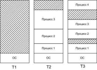 Фрагментация – это наличие большого числа несмежных участков свободной памяти очень маленького размера (фрагментов). Ни одна из вновь поступающих программ не может поместиться в этих участках при этом суммарный объем фрагментов может составить значительную величину, превышающую требуемый объем памяти.