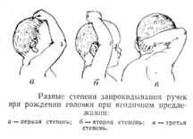 запрокидывают туловище на живот роженице, при этом головка свершает сгибание в шейном отделе. Головка прорезывается малым косым размером.