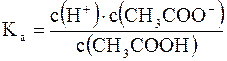 где с (H+) (или c (H3O+)), c(СН3СОО–) и c (СН3СООH) равновесные молярные концентрации ионов Н+, СН3СОО– и непродиссоциированных молекул кислоты.