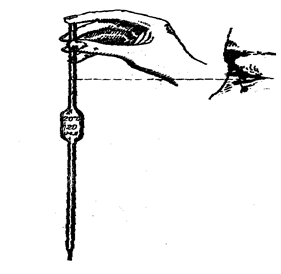 Держа пипетку вертикально над поверхностью раствора, ослабляют нажим указательного пальца на её горлышко, так чтобы жидкость медленно капала из носика пипетки в раствор, пока нижняя часть её мениска (или верхняя, если раствор интенсивно окрашен) не сравняется с верхней нулевой меткой на стенке пипетки. После этого нажим на горлышко пипетки быстро усиливают до полного прекращения истечения жидкости (рис. 47).