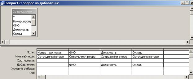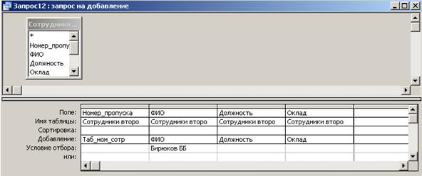 Обратите внимание, что после этой операции меняется вид бланка запроса: появляется новая строка Добавление, в которой надо указать поля исходной таблицы, из которых данные будут добавляться в таблицу Сотрудники ( рис.24.15).