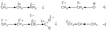На реакционную способность молекул влияют также заместители, связанные с атомом углерода, которые за счет проявляемых ими электронных эффектов приводят к изменению полярности связей и их прочности. Различают два типа электронных эффектов заместителей: индуктивный и мезомерный.