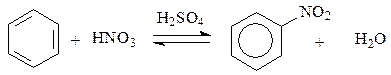 В реакциях нитрования генерирование электрофильной частицы происходит в результате взаимодействия азотной и серной кислот, что приводит к образованию катиона нитрония NO2+, который далее реагирует с ароматическим соединением: