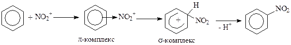 На первом этапе реакции образуется p-комплекс с электрофильной частицей (быстрая стадия), который затем превращается в s-комплекс (медленная стадия) за счет образования s- связи одним из атомов углерода с электрофильной частицей. Для образования s- связи с электрофильной частицей из сопряжения «вырывается» пара электронов, а образующийся продукт приобретает положительный заряд. В s-комплексе ароматичность нарушена, так как один из атомов углерода находится в sp3-гибридизации, а на пяти других атомах углерода делокализованы четыре электрона и положительный заряд.
