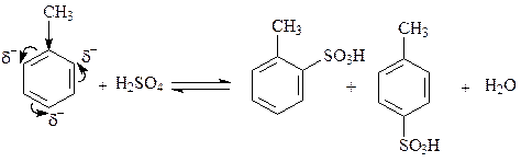 В реакциях сульфирования роль электрофильной частицы выполняет молекула SO3, образующаяся в результате реакции: 2H2SO4 «SO3 +H3O+ + HSO4-. Атомы серы в этой молекуле характеризуются сильным дефицитом электронной плотности и наличием частичного положительного заряда и, следовательно, именно атом S должен, как электрофил, связываться с атомом углерода бензольного кольца толуола.