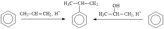 В качестве алкилирующих агентов при алкилировании бензола вместо алкилгалогенидов могут использоваться также алкены или спирты. Для образования электрофильной частицы – карбкатиона - необходимо наличие кислоты. Механизм реакции в этом случае будет отличаться лишь на стадии генерирования электрофильной частицы. Рассмотрим это на примере алкилирования бензола пропиленом и пропанолом-2: