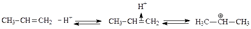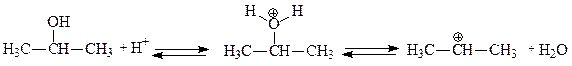 В случае использования в качестве реагента пропилена образование карбкатиона происходит в результате присоединения протона (по правилу Марковникова). При использовании в качестве реагента пропанола-2 образование карбкатиона происходит в результате отщепления молекулы воды от протонированного спирта.