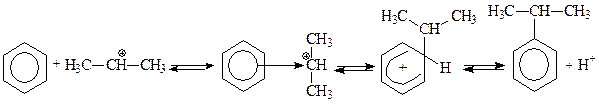 Образовавшийся изопропильный катион атакует p-электроны бензольного кольца, что приводит к возникновению p-комплекса, который далее превращается в s- комплекс с нарушенной ароматичностью. Последующее отщепление протона ведет к регенерации ароматической системы: