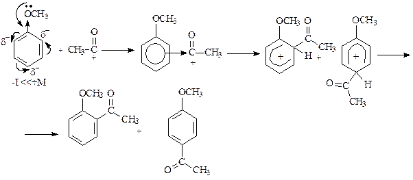 Образующийся катион ацилия сначала образует p-комплекс, из которого возникают главным образом два s -комплекса, в которых формирование s- связи между циклом и электрофильной частицей происходит преимущественно в орто- и пара-положениях, так как в этих положениях возникают частичные отрицательные заряды из-за электронного влияния метоксигруппы.
