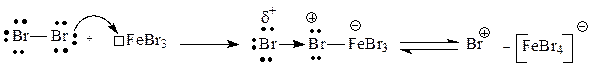 Галогенирование бензола и многих ароматических соединений действием самого галогена протекает только в присутствии катализаторов, таких как ZnCl2, AlCl3, FeBr3 и т.д. Катализаторами обычно являются кислоты Льюиса. Между атомом металла и атомом галогена образуется связь по донорно-акцепторному механизму, что вызывает поляризацию молекулы галогена, усиливая ее электрофильный характер. Полученный аддукт может подвергаться диссоциации с образованием комплексного аниона и катиона галогена, выступающего далее в качестве электрофильной частицы: