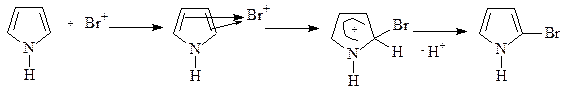 При проведении реакций электрофильная частица замещает протон в a-положении; если оба a-положения заняты, то замещение протекает по b-положению. В остальном механизм реакций электрофильного замещения аналогичен рассмотренным выше случаям. В качестве примера приведем бромирование пиррола: