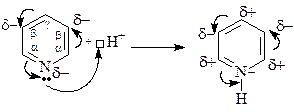 В случае протекания реакции в пиридиновом цикле замещение идет по одному из b-положений, в которых возникают частичные отрицательные заряды.