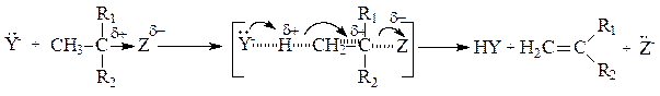 Если условия неблагоприятны для протекания реакции по механизму бимолекулярного нуклеофильного замещения, то можно ожидать, что основность нуклеофила, как донора пары электронов, определит направление реакции между субстратом и атакующей нуклеофильной частицей. В случаях, когда стерические препятствия затрудняют атаку нуклеофильной частицей атома углерода, нуклеофильная частица действует как основание и атакует С-Н кислотный центр в молекуле субстрата. Конечным итогом этой атаки на атом водорода будет b-элиминирование.
