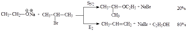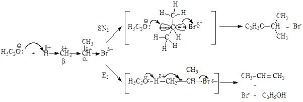 В молекуле субстрата вторичный атом углерода, связанный с двумя метильными группами, труднодоступен для нуклеофильной атаки этоксид-ионом, вследствие чего в результате реакции только 20% 2-бромпропана превращаются в 2-этоксипропан, являющийся продуктом реакции бимолекулярного нуклеофильного замещения. Более доступным для атаки этоксид-ионом является атом водорода в b-положении к уходящей группе (СН-кислотный центр):
