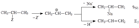 Реакциям мономолекулярного нуклеофильного замещения SN1 часто сопутствуют реакции мономолекулярного элиминирования Е1, что обусловлено наличием общей лимитирующей стадии – образование карбкатиона: