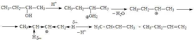 На первом этапе происходит протонирование атома кислорода гидроксильной группы, приводящее к превращению её в хорошо уходящую группу. Отщепление воды от оксониевого катиона приводит к образованию карбкатиона, который стабилизируется путем отщепления протона от возникающих СН-кислотных центров. В итоге реакции получится смесь двух алкенов, в которой будет преобладать более стабильный алкен, содержащий при двойной связи большее число заместителей.