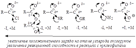 Величина положительного заряда, возникающего на атоме углерода оксогруппы, увеличивается с усилением электроноакцепторного характера заместителя (d+ возрастает с усилением отрицательного индуктивного эффекта по сравнению с положительным мезомерным эффектом). Отличием приведенных выше соединений от альдегидов и кетонов является то, что 2 электрона p-связи углерод-кислород участвуют в сопряжении с неподеленной парой р-электронов гетероатома (атомов галогена, серы, кислорода или азота), что приводит к повышению стабильности соединений. Нуклеофильное присоединение к карбонильной группе этих соединений приводило бы к изменению гибридизации атомных орбиталей углерода с sp2 на sр3 и разрушению системы сопряжения, уменьшению стабильности молекулы. Для сохранения сопряженной системы в реакциях с нуклеофилами после присоединения нуклеофильной частицы происходит отщепление уходящей группы и регенерация сопряжения. В итоге нуклеофильная частица оказывается связанной с ацильной группой – R-C=O, поэтому реакции производных карбоновых кислот называют реакциями ацилирования. Общая схема нуклеофильного замещения имеет вид: