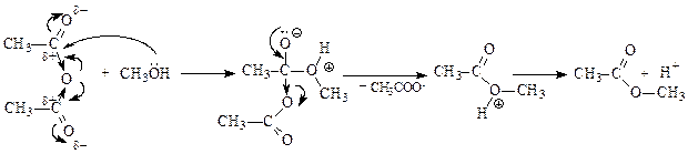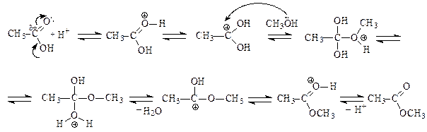 Присоединение протона к основному центру кислоты приводит к образованию карбкатиона - реакционноспособной электрофильной частицы, которая легко подвергается атаке нуклеофилом – молекулой спирта. Образовавшийся оксониевый катион, отщепляя воду, превращается в карбкатион, который регенерирует сопряженную систему путем отщепления протона, что приводит к образованию сложного эфира и возврату катализатора. Ионы водорода катализируют и прямую, и обратную реакции, равновесие реакции можно смещать, используя принцип Ле-Шателье.