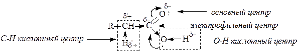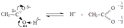 В отличие от альдегидов и кетонов, карбоновые кислоты имеют О-Н кислотный центр, за счет которого проявляют сравнительно сильные кислотные свойства. Сила карбоновых кислот зависит от величины эффективного положительного заряда на атоме углерода карбоксильной группы. Чем больше величина этого заряда, тем сильнее пара электронов атома кислорода гидроксильной группы вовлечена в р,p-сопряжение, тем сильнее поляризована связь и ослаблена связь О-Н, тем легче идет ее разрыв с образованием мезомерно стабилизированного карбоксилат-аниона: