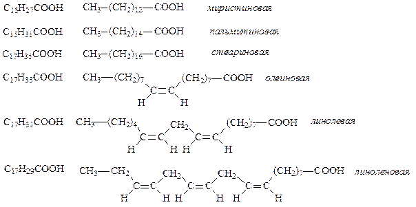 Химические и биологические свойства жира определяются входящими в его состав триацилглицеринами и в первую очередь длиной цепи, степенью ненасыщенности остатков жирных кислот и их расположением в триглицериде. В состав жиров входят в основном неразветвленные углеводородные радикалы жирных кислот, содержащие четное число атомов углерода (от 4 до 26), как насыщенные, так и моно- и полиненасыщенные. Наиболее часто в составе жиров встречаются миристиновая, пальмитиновая и стеариновая кислоты – представители насыщенных одноосновных карбоновых кислот, и олеиновая, линолевая, линоленовая – представители ненасыщенных одноосновных карбоновых кислот.
