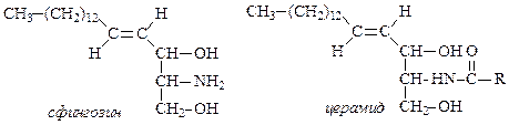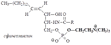В нервных тканях обнаружены производные сфингозина – сфингомиелины. При гидролизе сфингомиелины образуют одну молекулу жирной кислоты, одну молекулу сфингозина, одну молекулу азотистого основания (чаще это холин) имолекулу фосфорной кислоты. Именно поэтому сфингомиелины относятся к классу фосфолипидов.