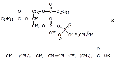 Молекулу фосфолипида, содержащую остаток непредельной кислоты (в данном случае олеиновой), представим как сложный эфир следующим образом: