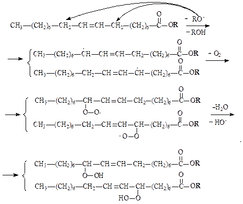 I-й этап – инициирование. На этом этапе образуются свободные радикалы, которые атакуют атомы Н метиленовых групп СН2, находящихся в a-положении по отношению к двойной связи. В результате образуются свободные радикалы аллильного типа, стабилизированные р,p-сопряжением.
