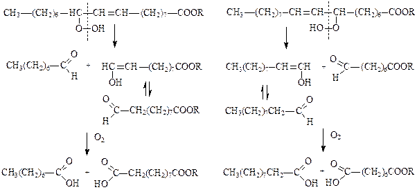III-й этап – разрыв связей углерод-углерод, находящихся в a-положении по отношению к двойной связи гидропероксидов, в результате чего образуются енолы и альдегиды, которые окисляются далее до соответствующих кислот.