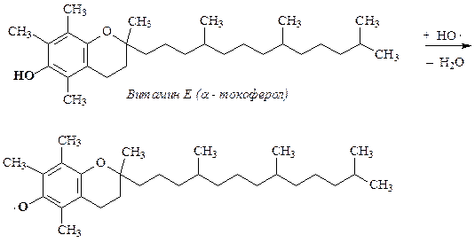 Глубина пероксидного окисления липидов зависит в первую очередь от состава липидов: с увеличением степени ненасыщенности жирных кислот, входящих в состав липидов, скорость окисления возрастает. Пероксидное окисление липидов приводит к повреждению клеточных мембран, структурными элементами которых являются липиды. Антиоксидантами по отношению к ненасыщеным липидам являются витамины группы Е – токоферолы, которые ингибируют процесс пероксидного окисления. Антиокислительная функция токоферолов определяется наличием подвижного атома Н и способностью реагировать с активными радикалами с образованием малоактивных радикалов, стабилизированных р,p-сопряжением.