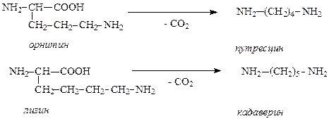 Диамины – органические соединения, содержащие в молекуле две аминогруппы. В природе чаще всего встречаются пента- и тетраметилендиамины Н2N(CH2)nNH2, где n = 5 и 4, содержащиеся в продуктах гнилостного распада белков – соответственно, кадаверин и путресцин. Эти диамины образуются при ферментативном декарбоксилировании, соответственно, лизина и орнитина: