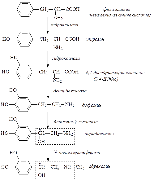 Биосинтез этих катехоламинов осуществляется из фенилаланина через тирозин по схеме: