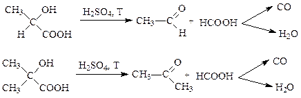 При нагревании a-гидроксикислот с серной кислотой происходит их превращение в карбонильное соединение и муравьиную кислоту, которая дальше разлагается на угарный газ и воду: