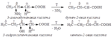 Нагревание b-амино- и b-гидроксикислот ведет к внутримолекулярному отщеплению аммиака или воды и образованию a,b-непредельных кислот: