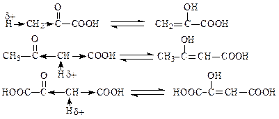 При наличии двух карбоксильных групп в молекулах оксокислот более сильные кислотные свойства проявляет та карбоксильная группа, ближе к которой расположена оксогруппа. Из-за более близкого расположения электроноакцепторного заместителя на атоме углерода такой карбоксильной группы возникает больший частичный положительный заряд и связь О-Н поляризуется в большей степени, что приводит к усилению кислотности. Присутствие в молекулах двух сильных электроноакцепторных заместителей приводит к возникновению С-Н кислотного центра, благодаря которому для оксокислот характерна кето-енольная таутомерия.