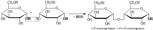 Мальтоза (солодовый сахар) – дисахарид, получающийся при ферментативном расщеплении крахмала, состоит из двух остатков a-D-глюкопиранозы. Оба остатка глюкозы имеют пиранозный цикл и соединяются друг с другом посредством a-1,4- гликозидной связи, в образовании которой участвует полуацетальная гидроксильная группа одной молекулы и гидроксильная группа у четвертого атома углерода другой молекулы: