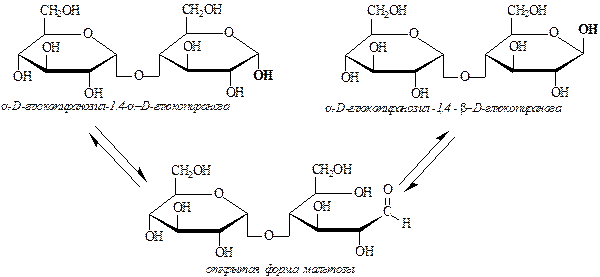 Поскольку в молекуле мальтозы содержится свободная полуацетальная гидроксильная группа, то для растворов мальтозы характерна мутаротация, обусловленная цикло-оксо-таутомерией: