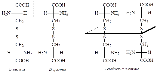 Некоторые аминокислоты (цистин, треонин, изолейцин и гидроксипролин) имеют два хиральных центра и могут существовать в виде четырех стереоизомеров. Однако для цистина число возможных стереоизомеров меньше из-за наличия плоскости симметрии у мезоформы, которая оптически неактивна.
