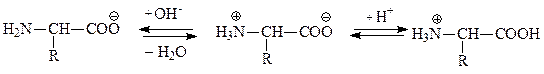 При высоких значениях рН аминокислоты в водных растворах находятся в виде аминокарбоксилат-анионов. При промежуточных значениях рН основная частица, находящаяся в растворе в существенных количествах, – это цвиттер-ион, молекулярная форма RCH(NH2)CООН не присутствует в сколько-нибудь значительной степени. На существовании в сильно кислой среде аминокислот в катионной форме и в щелочной среде – в анионной форме основано разделение аминокислот методом электрофореза: катионы под действием электрического тока перемещаются к катоду (отрицательно заряженному электроду), анионы – к аноду (положительно заряженному электроду). рН раствора аминокислоты, при котором средний заряд молекулы равен нулю, называется изоэлектрической точкой (рI). Состояние аминокислоты, в котором ее заряд равен нулю, называется изоэлектрическим состоянием (т.е. в растворе концентрация биполярных ионов аминокислоты максимальна, а концентрации катионных и анионных форм аминокислоты минимальны и равны между собой). Для моноаминомонокарбоновых кислот значения рН, при котором они находятся в изоэлектрическом состоянии, лежат в пределах 5.5-6.3, что близко к нейтральной среде, поэтому такие аминокислоты называют нейтральными. Для моноаминодикарбоновых кислот значения рН, при котором они находятся в изоэлектрическом состоянии, лежат в сильно кислой среде (рI<3.1), поэтому такие аминокислоты называют кислыми. У диаминомонокарбоновых кислот значения рН в изоэлектрическом состоянии лежат в сильно щелочной среде (рI>9.8), такие аминокислоты называют основными.