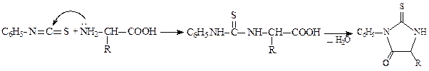 Дальнейшая обработка слабой кислотой без нагревания приводит к отщеплению от пептидной цепи N-концевой аминокислоты в виде фенилтиогидантоинового (ФТГ) производного, которое затем идентифицируется хроматографически. Последующее добавление к укороченному на одну аминокислоту пептиду фенилизотиоцианата в конечном итоге опять приводит к отщеплению аминокислоты с N-конца в виде ФТГ-производного. Таким образом можно определить аминокислотную последовательность, идентифицируя отщепляющиеся аминокислоты в виде их ФТГ-производных.