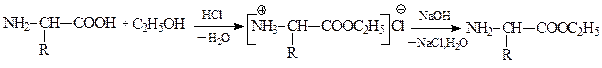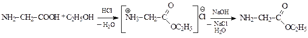 Аминокислоты образуют сложные эфиры, реагируя с избытком спирта в присутствии HCl, как катализатора. Реакция протекает в спиртовой среде, а образующийся сложный эфир в виде соли выпадает в осадок. Действуя более сильными основаниями на аммониевую соль сложного эфира, можно выделить сложный эфир в свободном виде: