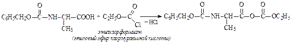 2) активировать карбоксильную группу аланина, содержащего защищенную аминогруппу, превратив ее в смешанный ангидрид действием этилхлорформиата: