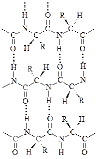 В b-структуре полиамидные цепи располагаются рядом в антипараллельном положении, образуя слой полипептидных цепей, связанных между собой водородными связями. При таком строении боковые цепи полипептидных молекул лежат попеременно над и под плоскостью слоя.