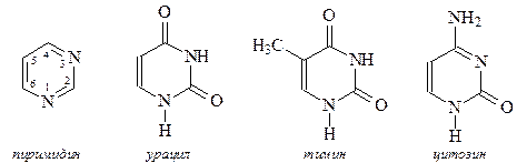 Существуют также некоторые различия в азотистых основаниях, входящих в состав нуклеиновых кислот: аденин, гуанин, цитозин образуются при гидролизе и ДНК, и РНК, в качестве четвертого основания ДНК содержат тимин, РНК – урацил. Урацил, тимин и цитозин представляют собой производные пиримидина: