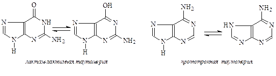 Для кислородсодержащих азотистых оснований характерна лактам-лактимная таутомерия, а для пуриновых оснований – прототропная: