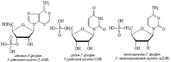 Нуклеозиды за счет гидроксильных групп рибозы или дезоксирибозы могут реагировать с кислородсодержащими кислотами с образованием сложных эфиров. Эфиры нуклеозидов и фосфорной кислоты называются нуклеотидами. Сложноэфирная связь может образовываться между остатком фосфорной кислоты и гидроксильной группой в положении 5¢- или 3¢-рибозы или дезоксирибозы. Названия нуклеотидам дают либо как сложным эфирам фосфорной кислоты, либо как кислотам, так как остаток фосфорной кислоты содержит гидроксильные группы, за счет которых нуклеотиды могут выступать в качестве кислот.В названии нуклеотидов, как эфиров, сначала называется нуклеозид, затем указывается положение остатка фосфорной кислоты (3¢ или 5¢) и добавляется название кислотного остатка – фосфат. В названиях нуклеотидов как кислот сначала указывают положение сложноэфирной связи (3¢ или 5¢), затем идет название азотистого основания с добавлением окончания «овая кислота»: