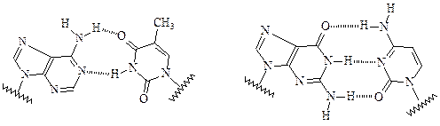 Между остатками аденина и тимина образуются две водородные связи, между остатками гуанина и цитозина – три. Водородные связи между комплементарными основаниями являются одним из видов взаимодействий, стабилизирующих двойную спираль.