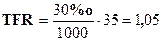 Сначала рассчитаем суммарный коэффициент рождаемости TFR (по формуле 4.6), исходя из того, что число групп женщин фертильного возраста (от 15 до 49) равняется 35.